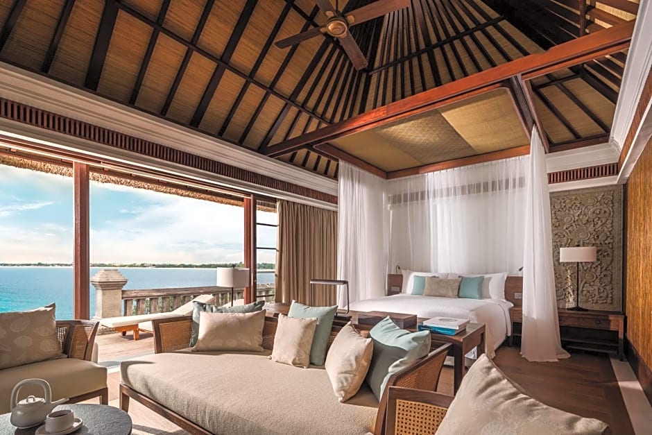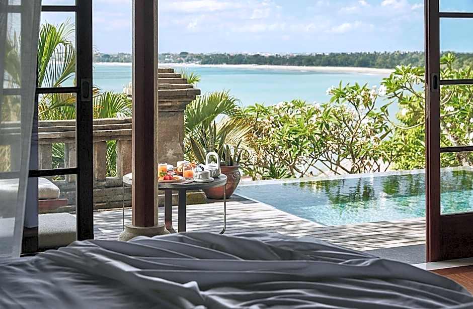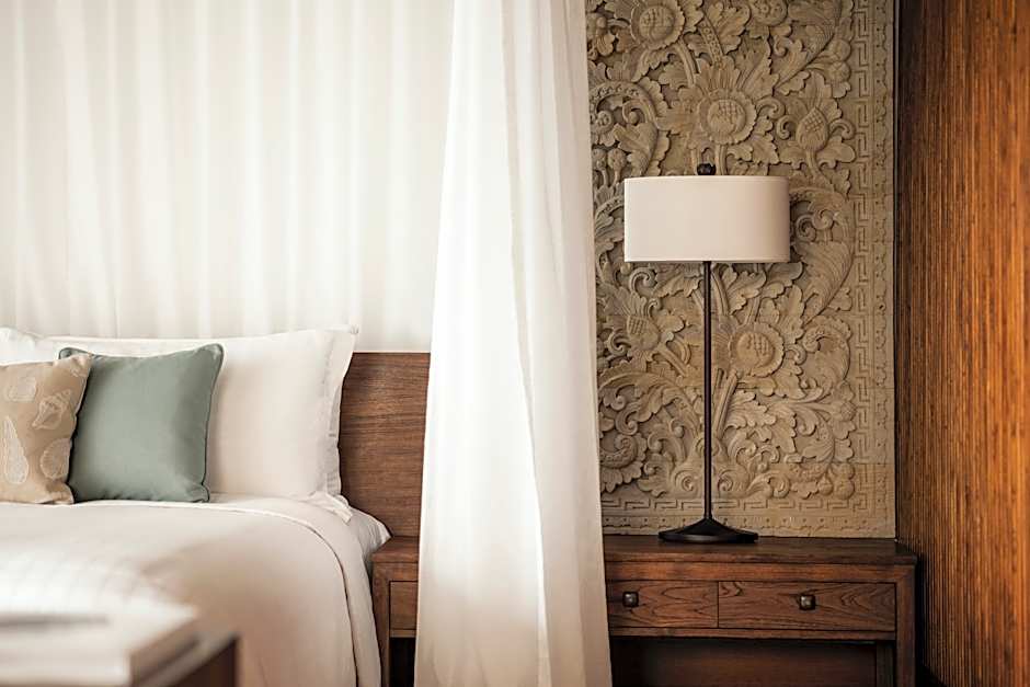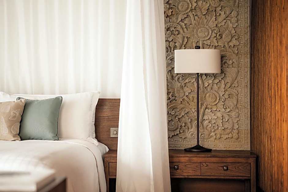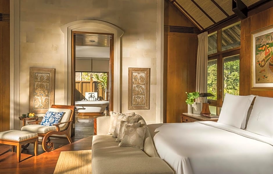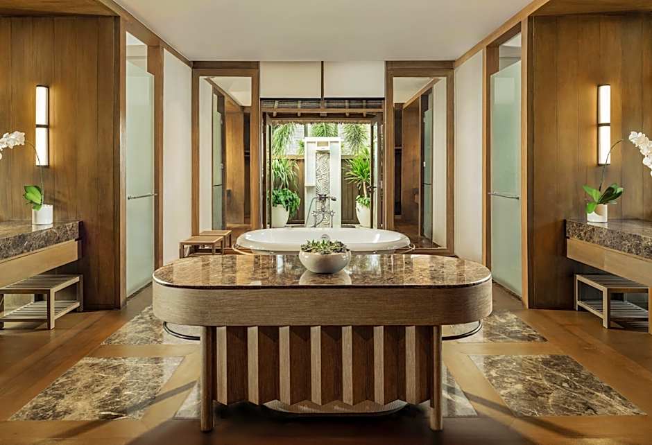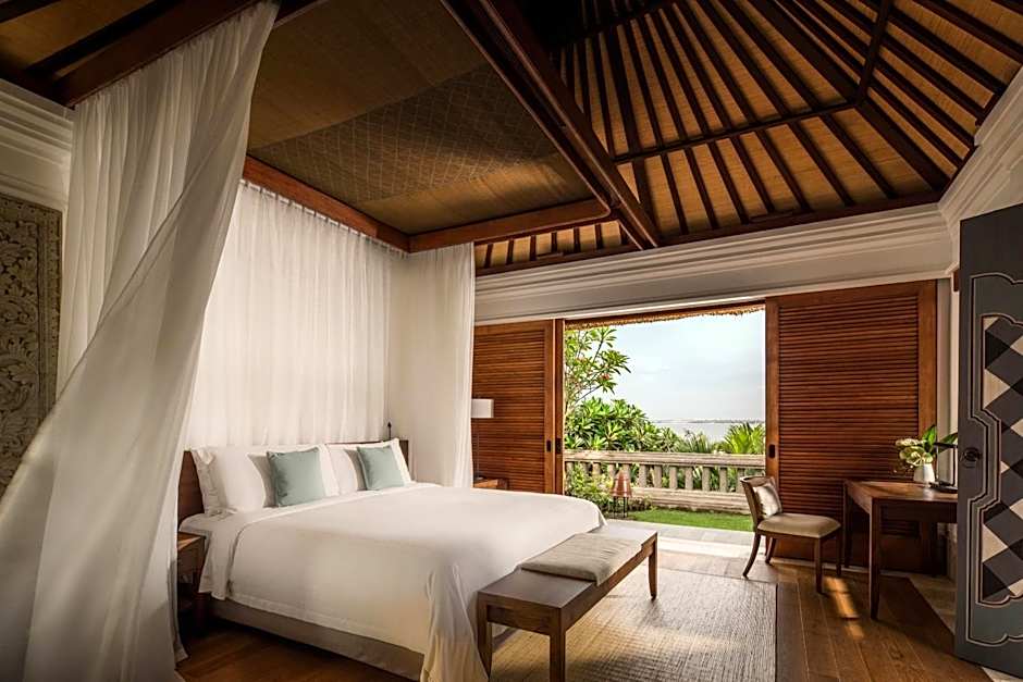 This villa features 250-sqm of indoor and outdoor living with a 13-sqm infinity-edge pool. Inspired by a characteristic Balinese courtyard house, the thatch-roof sleeping, bathing and living/dining pavilions are secluded within a private, walled tropical garden. The spacious bedroom and bathroom are air-conditioned, while the living area bale is open-air. Partial ocean or resort view, 1 bathroom with soaking tub, and both indoor and outdoor showers are offered. This villa sits in the middle rows of villas nestled among resort gardens. This villa can hold up to 3 adults or 2 adults plus 1 child.